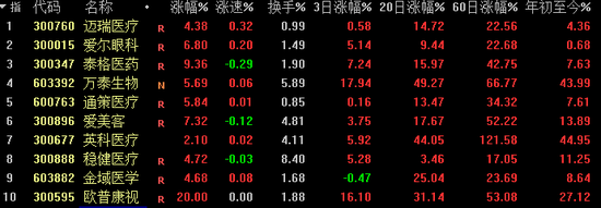 医疗板块之所以今日有如此出色的表现,板块内核心个股功不可没,财联社统计发现市值前10名的个股今日集体大涨,涨幅最小的是去年A股的第一大牛股英科医疗,“仅”上涨了2.1%,而其它9只权重股涨幅均在4%以上,其中昨日刚公布业绩预增公告的欧普康视更是收获20%涨停,此外,爱尔眼科、泰格医药、万泰生物、通策医疗的涨幅均超过5%。