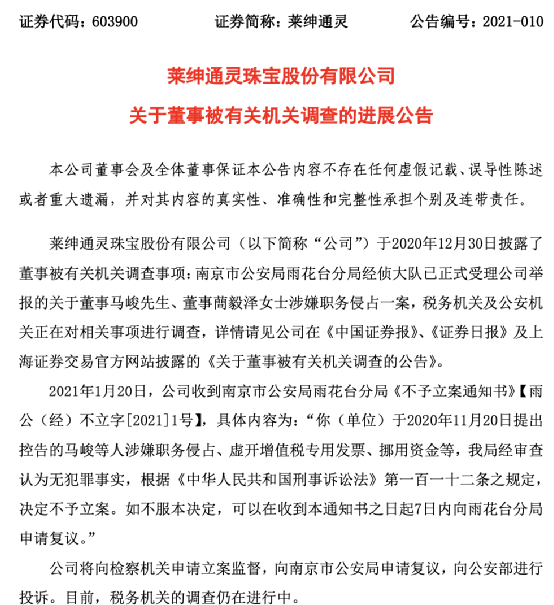 1月20日晚间,莱绅通灵发布公告称,公司收到了南京市公安局雨花台分局出具的《不予立案通知书》,内容为:“你(单位)于2020年11月20日提出控告的马峻等人涉嫌职务侵占、虚开增值税专用发票、挪用资金等,我局经审查认为无犯罪事实,根据《中华人民共和国刑事诉讼法》第一百一十二条之规定,决定不予立案。”
