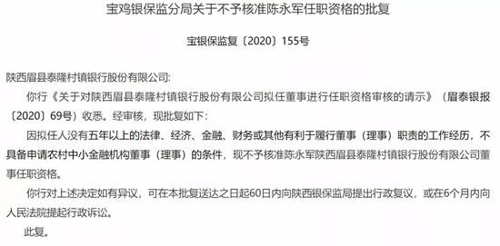 例如,陕西眉县泰隆村镇银行陈永军“因拟任人没有五年以上的法律、经济、金融、财务或其他有利于履行董事(理事)职责的工作经历”而不予核准。