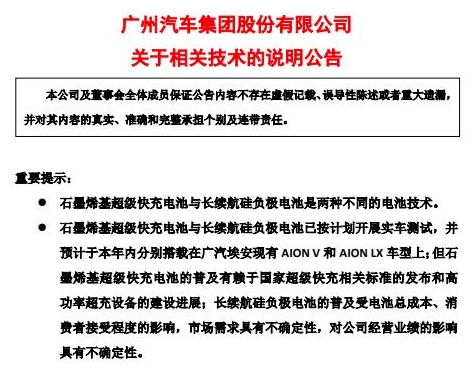 同日晚间,广汽集团发布公告,表示石墨烯基超级快充电池的普及,有赖于国家超级快充相关标准的发布,和高功率超充设备的建设进展;长续航硅负极电池的普及,受成本、消费者接受程度影响,对经营业绩的影响具有不确定性。