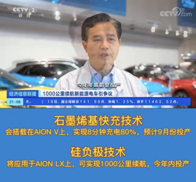 古惠南表示:“石墨烯基的快充技术,会搭载在AIONV上,续航可以达到500km以上,实现了8分钟充满80%,预计9月份会投产。第二项技术是硅负极技术,将应用于AIONLX上,可实现1000km的续航。今年年底前会投产,同样成本也会增加。”