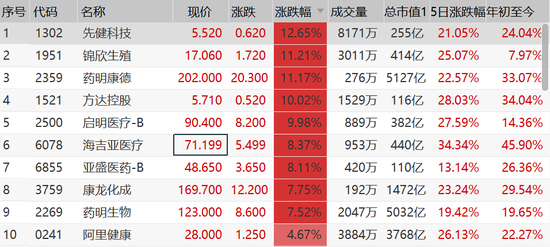 先建科技暴涨13%,锦欣生殖、药明康德涨11%,启明医疗涨10%,药明巨诺涨超12%,亚盛医药、药明生物等涨超7%,阿里健康涨5%。