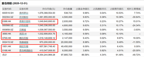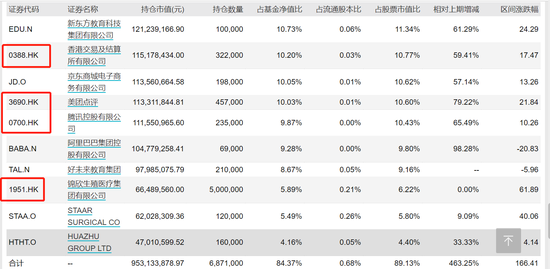易方达蓝筹精选混合中,美团占比9.59%,腾讯占比9.48%,港交所9.4%,颐海国际3.07%,投资港股超3成。