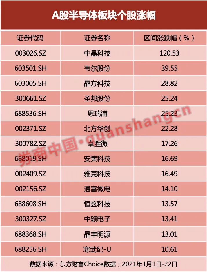 个股方面,新股中晶科技年内大涨逾120%;韦尔股份大涨近40%,市值逼近2800亿元;晶方科技、圣邦股份、思瑞浦、北方华创等涨幅均超过20%,卓胜微、安集科技、雅克科技、通富微电、恒玄科技、中颖电子、晶丰明源、寒武纪-U等涨逾10%。
