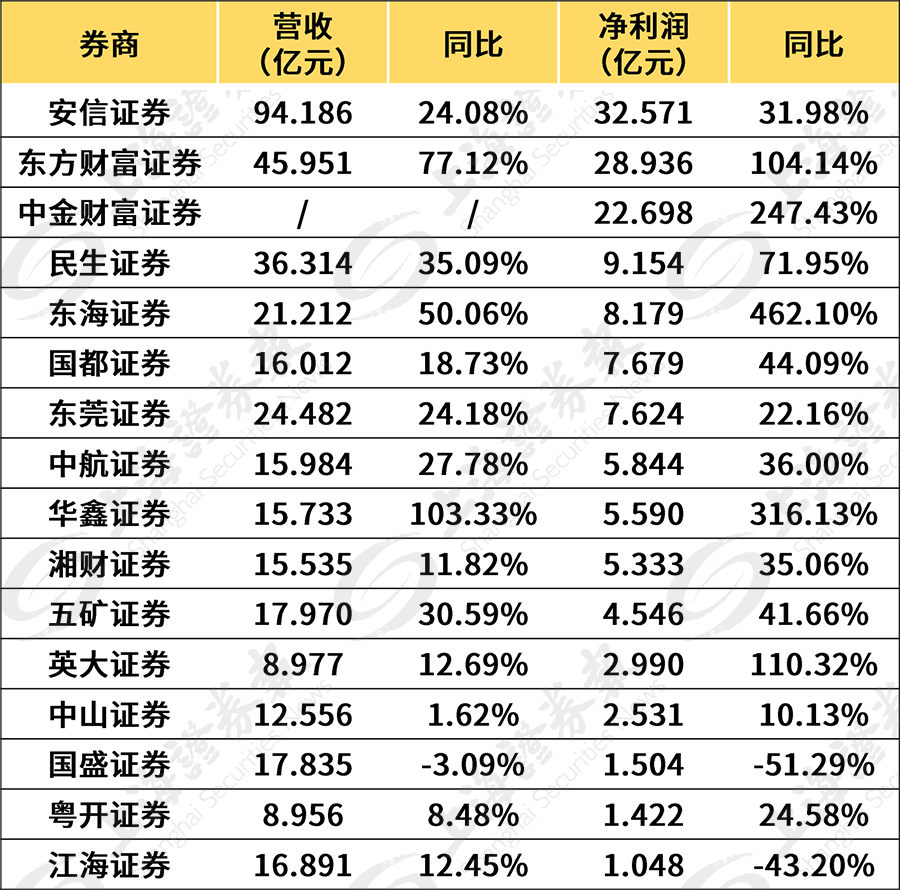 从净利润同比增幅来看,共有东海证券、华鑫证券、中金财富证券、英大证券、东方财富证券净利润增长较大,同比增幅均超100%。上市券商中,中信建投与红塔证券业绩增幅较高,约为70%左右;长城证券、国元证券、国海证券的业绩增幅也高于45%。