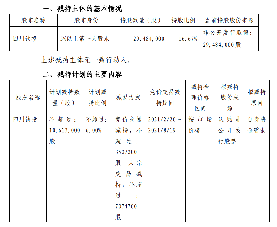 若按照1月22日的收盘价19.08元进行减持,四川铁投本次最多减持2个亿。
