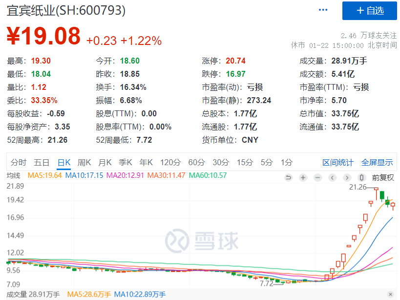 数据显示,宜宾纸业股价从1月6日截至1月19日期间10个交易日,市值从16亿元涨到了34亿元,实现翻倍。成为新年第一妖股。