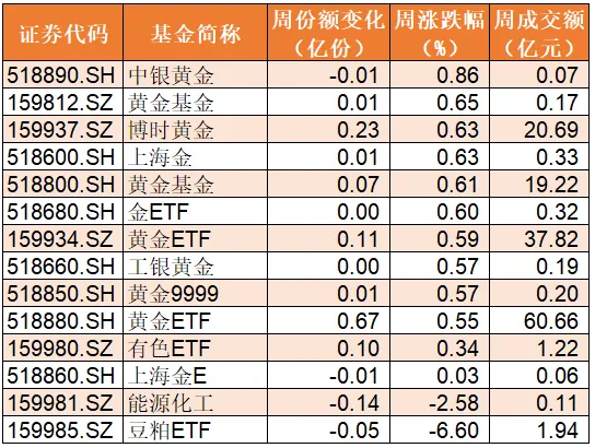 商品ETF本周除豆粕ETF下跌6.6%、能源化工下跌2.58%外,其余品种全线上涨,其中黄金相关ETF普涨约0.6%;此外份额上,均没有增减过亿份的品种。