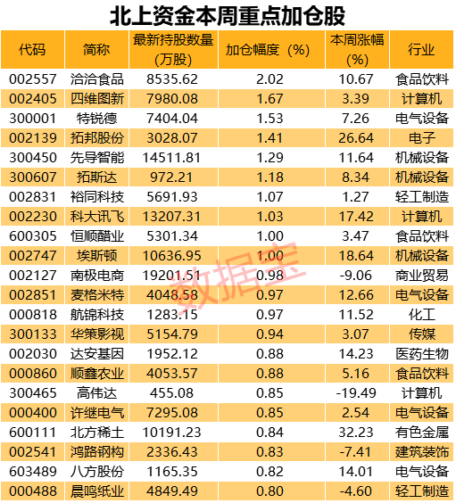 本周北上资金加仓股共790只,以增持股占A股总股本比例来看,加仓幅度超0.5%的有50只。食品股洽洽食品的加仓力度最大,最新持股数为8535.62万股,与上周末的持股数量相比,增长1022.87万股,增持股数量占总股本2.02%;紧随其后是四维图新,加仓幅度为1.67%;其他加仓幅度靠前的还有特锐德、拓邦股份、先导智能、拓斯达、裕同科技等。