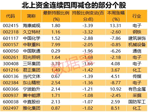 北上资金连续4周卖出97股。分行业来看,化工行业个股数量居前,有9只。从持股比例变动情况来看,与4周前相比,14股减仓比例超1个百分点。海康威视减仓幅度最大,相比4周前减仓了3.39个百分点,其他减仓幅度较大的还有久立特材、中国化学、中联重科、中国联通等。