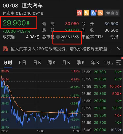截至1月22日收盘,恒大汽车H股股价报29.90港元,目前总市值达2636亿港元。