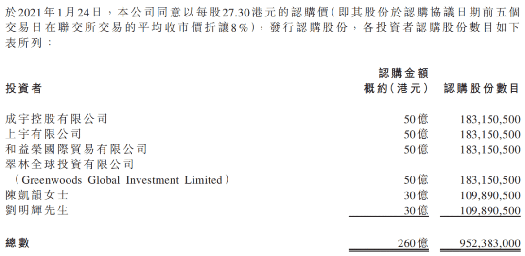 公告表明,本次增发对象包括成宇控股、上宇有限公司、和益荣国际贸易、翠林全球投资、陈凯韵女士、刘明辉先生,具体股数如下: