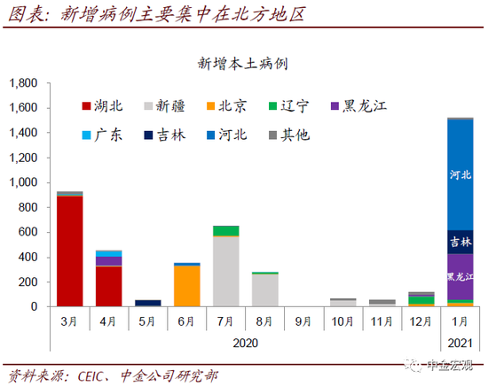 1月以来国内疫情扩散加速,主要集中在北方地区。1月1日至23日,累计新增本土病例1,589例,已经超过去年6、7、8三个月本土病例数总和1,288例。1月以来本土新增病例主要集中在河北、黑龙江和吉林三省,截至1月23日,三地分别新增908、395和206例;1月以来本地新增病例超过10例的地区还有北京、辽宁和上海,分别新增34、27和12例。