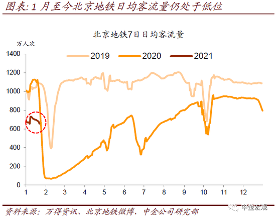 部分地区市内交通受到疫情防控影响明显回落。北京自12月下旬本地病例上升以来,地铁客流量明显下降。北京市交通部门预计[4],春节期间市内公共交通、公路道路交通量较2020年回升,但仍低于2019年,其中,地面公交2.02亿人次,较2020年上升36%,较2019年下降31%;轨道交通2.76亿人次,较2020年上升78%,较2019年下降24%。在1月份受疫情影响最大的河北省内,石家庄已经从1月9日开始暂停地铁运营。