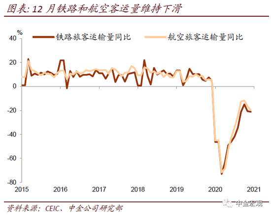 受疫情防控影响,今年春节期间旅客出行仍低于2019年。12月,铁路和航空旅客运输量同比分别下降21.1%和19.8%,连续两个月下滑。有关部门预计,今年春运客运量较2020年回升,但是仍大幅低于2019年。