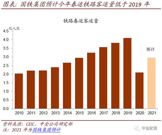 ► 国铁集团预计今年全国铁路客运量低于2019年。国铁集团负责人1月15日介绍,今年铁路春运节前车票预售较往年同期下降近6成,预计今年全国铁路春运客流2.96亿人次[1]。该预测数较2020年春运铁路客运量2.1亿人次[2]增长41%,但是仍较2019年4.1亿人次[3]下滑28%。