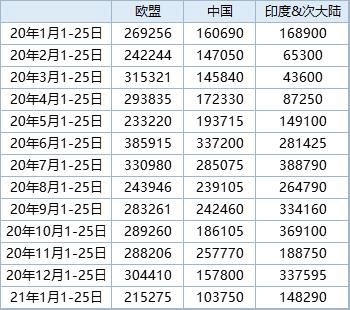 据船运调查机构ITS周三公布的数据显示,1月1-25日马来西亚对印度棕榈油出口量为148290吨,较上月同期的337595吨降逾56%,降幅较前20日小幅收窄,刷新九个月低位;马来对欧盟棕榈油出口量为215275吨,较上月同期下降29.3%,创过去一年同期新低;本月前25日马来对中国棕榈油出口量为103750吨,较上月同期下降34.3%,降幅较前20日显著收窄,亦刷新过去一年同期低位。