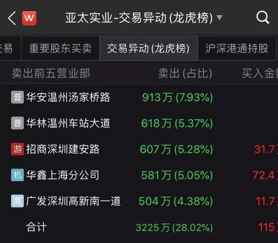 1月22日,就有温州席位大笔卖出亚太实业。当日的盘后龙虎榜显示,华安证券温州汤家桥路证券营业部、华林证券温州车站大道证券营业部分别卖出913.40万元和618.63万元,位居卖一和卖二席位。