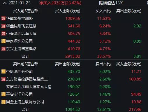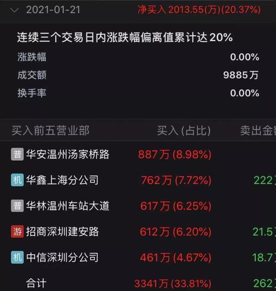 1月19日-21日,华安温州汤家桥路买入887万元,位居买一席位;华林证券温州车站大道证券营业部买入617.86万元,位居买三席位。