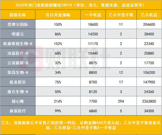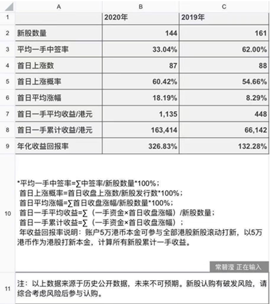 平均一手中签率为33.04%,首日一手平均收益1135港元,首日一手累计收益为163414港元,年化收益回报率326.83%……刚刚过去的2020年,港股打新成为了内地与香港两地投资者的热捧对象。