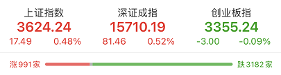 本周一,上证指数震荡攀升,续创阶段新高,收盘涨0.48%,报3624.24点;深证成指涨0.52%,报15710.19点;创业板指冲高回落,收盘跌0.09%,报3355.24点,盘中一度涨至2%。两市成交额超1.2万亿元,近16个交易日14天破万亿;北上资金净买入19.31亿元。