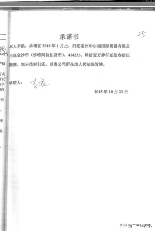 此案的重要证据是一份签有李浪名字的承诺书,承诺上称,“本人李浪承诺在2016年1月止,归还常州华尔瑞国际贸易有限公司现金沙币(沙特阿拉伯货币):414235……”