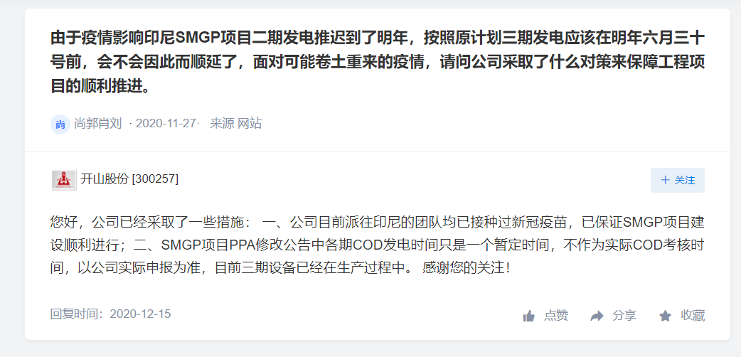 另外,对于印尼SMGP项目二期发电推迟到2021年以及三期是否会顺延的提问,公司曾表示已经采取了措施,包括派往印尼的团队均已接种过新冠疫苗,已保证SMGP项目建设顺利进行;三期设备已经在生产过程中等。