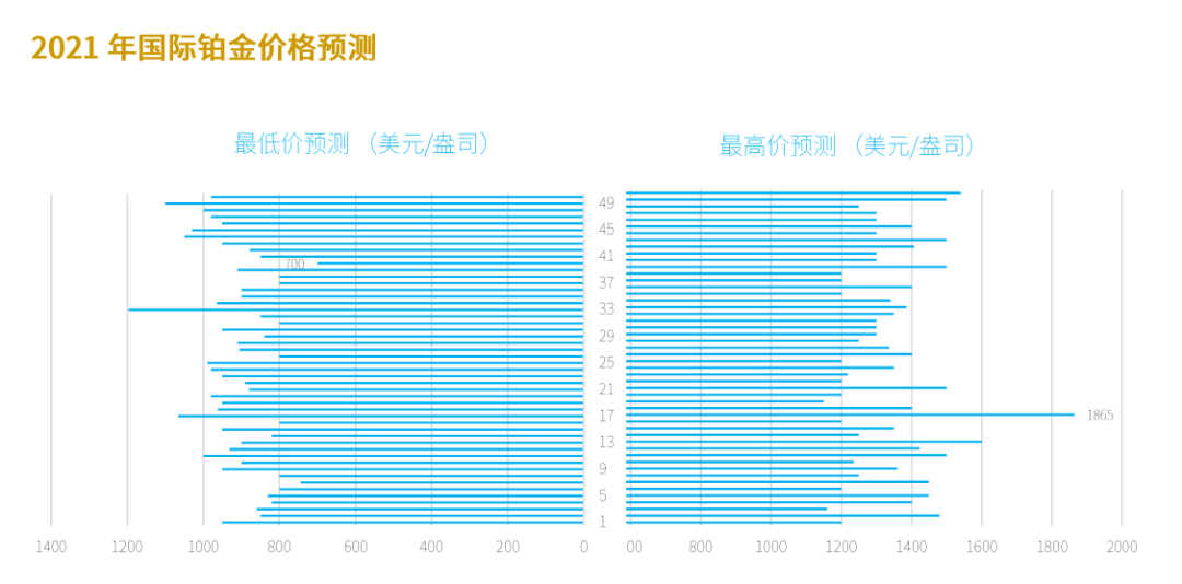 国际铂金:2021年预测最高价(平均价)每盎司1343.06美元,最低价(平均价)每盎司911美元,2021年终预测收盘价(平均价)每盎司1186.82美元,2021年终预测收盘价(中位数)每盎司1200美元。