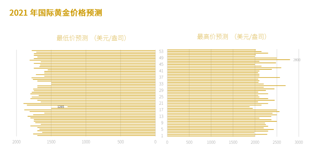 国际金价:2021年预测最高价(平均价)每盎司2248.67美元,最低价(平均价)每盎司1707.48美元,2021年终预测收盘价(平均价)每盎司2001.43美元,2021年终预测收盘价(中位数)每盎司2000美元。