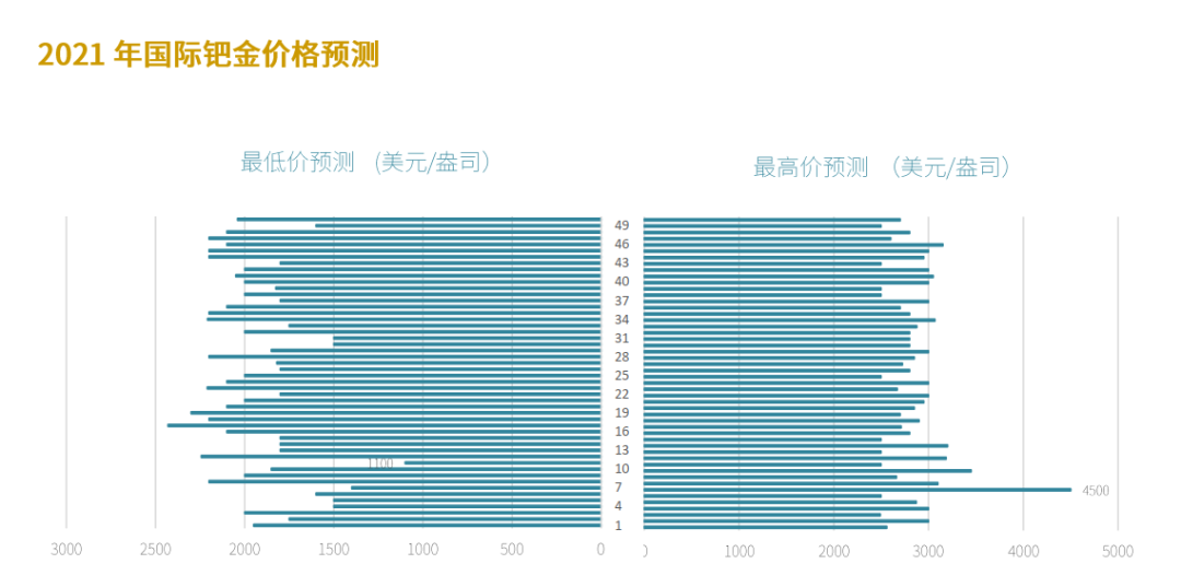 国际钯金:2021年预测最高价(平均价)每盎司2851.23美元,最低价(平均价)每盎司1931.52美元,2021年终预测收盘价(平均价)每盎司2389.42美元,2021年终预测收盘价(中位数)每盎司2470美元。