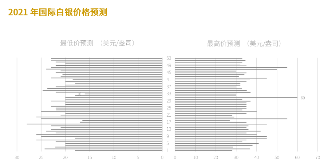国际银价:2021年预测最高价(平均价)每盎司36.41美元,最低价(平均价)每盎司21.7美元,2021年终预测收盘价(平均价)每盎司29.97美元,2021年终预测收盘价(中位数)每盎司30美元。