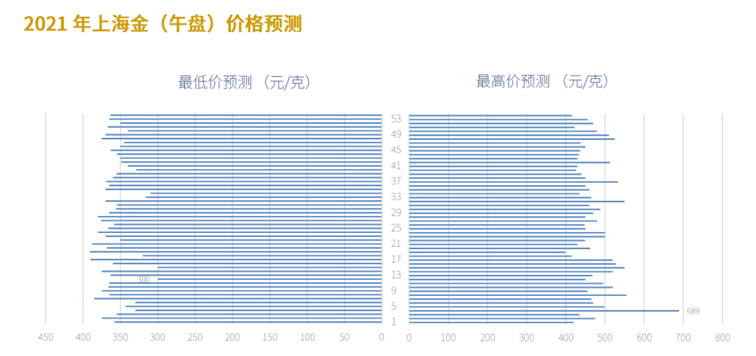 人民币报价上海金:2021年预测最高价(平均价)每克472.84元,最低价(平均价)每克357.11元;2021年终预测收盘价(平均价)每克418.65元,2021年终预测收盘价(中位数)每克420元。