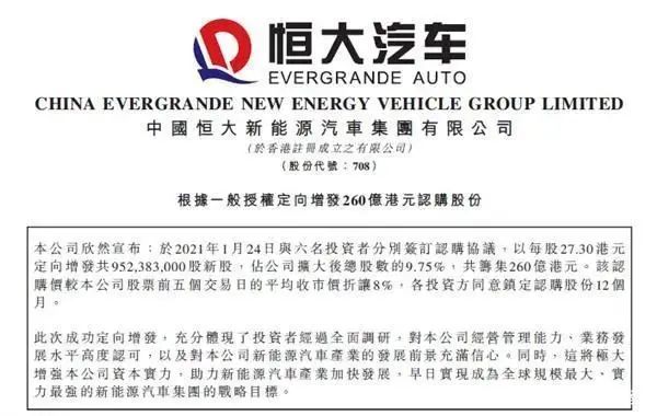 恒大汽车在公告中表示:此次定向增发后,将极大地增强公司的实力,助力新能源汽车产业加快发展,早日实现成为全球规模最大、实力最强的新能源汽车集团。