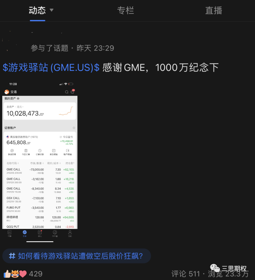 除了华尔街精英被打爆之外,网络上还流传了以为很可能也被打爆了国内的的散户。在25号晒账户的时候,我们看到他卖空多个看涨期权并且也庆祝了账户资产达到了1000万。但是26号股价暴涨之后我们再也没有听到他的声音。