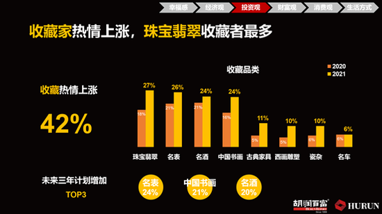 收藏热情较去年提高42%。珠宝翡翠超过名酒名表,成为最青睐收藏品。但名表排在未来三年将增加的收藏品首位,其次是中国书画和名酒