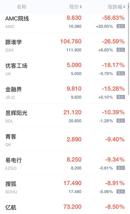 跟谁学跌超26%,搜狐跌近9%,网易有道、陆金所跌超6%,趣头条、荔枝跌超5%,金山云跌超2%,网易、哔哩哔哩跌超1%。