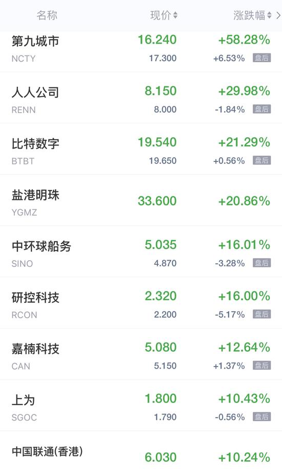 第九城市涨58%,人人公司涨近30%,比特数字涨超21%,研控科技涨超16%,亿邦国际、嘉楠耘智涨超10%。
