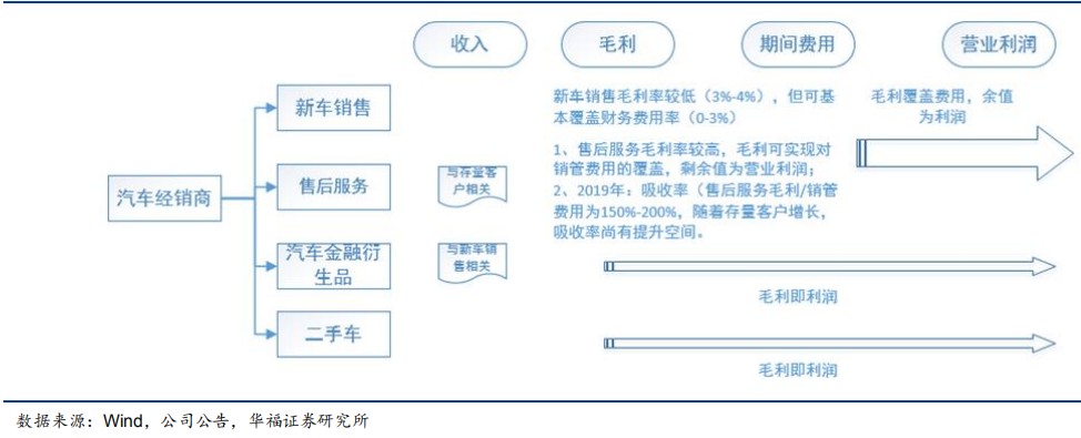 新车盈利主要为进销差价,一般毛利率在5%以内;售后服务是通过提供车辆维修养护服务收取工时费用,通过销售车辆零配件赚取差价,毛利率普遍超过40%;而汽车金融服务主要分为购车贷款、保险及融资租赁业务,经销商主要赚取手续费和佣金,部分经销商也自营汽车金融业务赚取利息。