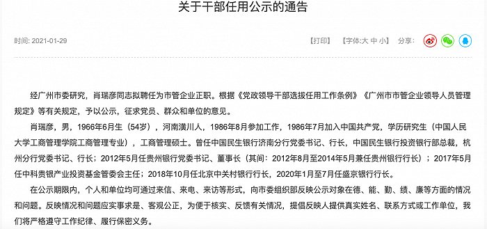 1月29日,广州银行官网披露的《关于干部任用公示的通告》,经广州市委研究,肖瑞彦同志拟聘任为市管企业正职。界面新闻记者从知情人士处获悉,公示后,肖瑞彦大概率将出任广州银行行长。该行前行长蔡建已调任广州农商银行。