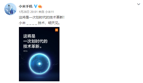 为了这次隔空充电技术的发布,小米在前一天就进行了预热。1月28日20:01小米手机官方微博发布消息称将带来一次划时代的技术革新。
