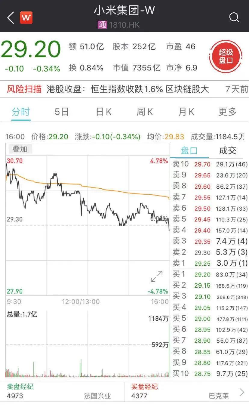 市场对小米发布的新技术反应平淡。今日,小米高开4%,截至收盘,微跌0.34%,报29.20港元/股。在1月初创下35.30港元/股的阶段性高点后,小米近期震荡下跌,股价已较高点跌去近20%。