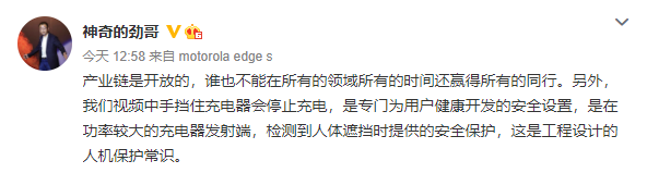 对此,陈劲专门科普称,视频中手挡住充电器会停止充电,是专门为用户健康开发的安全设置,是在功率较大的充电器发射端,检测到人体遮挡时提供的安全保护,这是工程设计的人机保护常识。