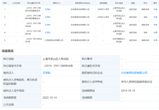 而这已经不是王思聪第一次被强制执行了,早在2019年11月份,王思聪所全资持有的北京普思投资有限公司股权被上海市宝山区人民法院冻结,不过当时并没有说明冻结金额,冻结日期长达3年,需到2022年10月14日。
