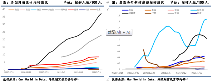 新冠疫情对全球经济和石油需求造成毁灭性打击,其影响远超于人类历史上任何一次金融危机或经济危机。但是好在随着疫苗研制成功,史上最大的疫苗接种运动正拉开帷幕,截至2021年1月28日,全球共有6300万的新冠疫苗在56个国家接种注射,平均每天有321万人接种他们的第一针或第二针疫苗。但疫苗接种水平在高收入与低收入经济体中呈现明显不平衡状态,且欧美疫苗接种进度较慢。