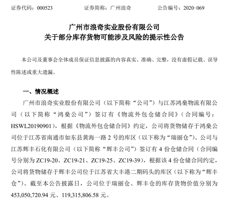 广州浪奇2020年9月27日晚的一纸公告震惊市场,公司称存于鸿燊公司、辉丰公司的价值为5.72亿元存货无法正常开展货物盘点及抽样检测,同时,鸿燊公司、辉丰公司均否认保管有公司储存的货物。