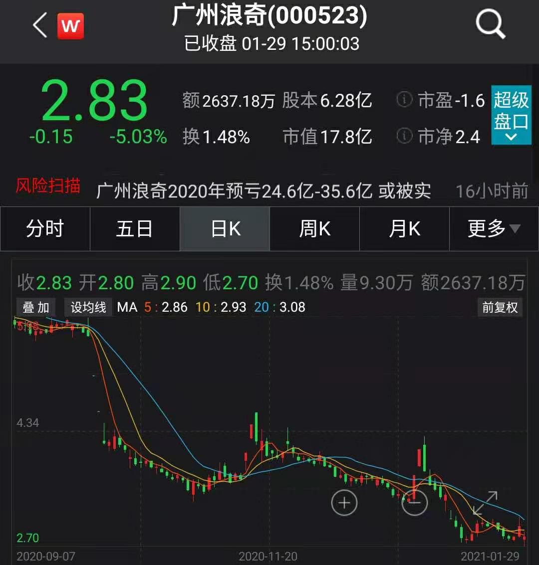 广州浪奇1月31日下午披露2020年业绩预告,公司预计亏损24.6亿元–35.6亿元,上年同期盈利0.61亿元;公司预计2020年期末归属于母公司所有者权益约为-12.5亿元至-19.5亿元,公司股票因此可能被实施退市风险警示;此外,公司员工邓煜、黄健彬等人涉嫌挪用资金罪一案,公安机关认为有犯罪事实发生,需要追究刑事责任,且属于管辖范围。