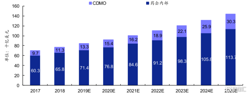 图 全球生物制药生产市场规模预测:药企内部 vs CDMO