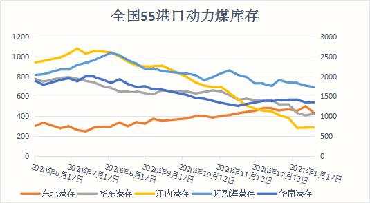 当前上游煤市稍有走弱,产地煤价高位回落100-120元/吨,港口市场鉴于后期供需形势改善,现货价格大幅急跌,但电厂库存处于低位,节前补库需求仍在。截止1月29日,55港库存环比续降2.4%至4214.6万吨,再创阶段新低。环渤海港库存同样下降2.3%至1731.2万吨,东北港存受疫情影响解除,回落至433.3万吨,华东港存及江内港存有所增加。