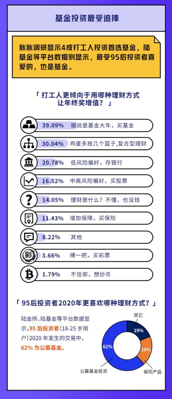 脉脉调研显示,39.09%的打工人更倾向于选择投资基金为年终奖增值;而最受 95 后投资者喜爱的,也是基金。陆基金等平台数据显示,95 后投资者62%的交易为公募基金投资。