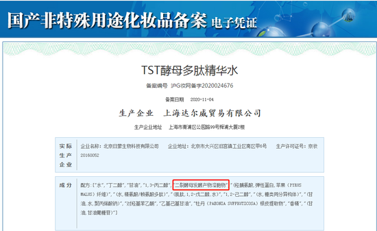 在国家药品监督管理局官网上,记者查询TST产品成分发现,所谓的活性酵母,只是“二裂酵母发酵产物溶胞物”。记者查询专业资料发现,这种成分与酵母菌并无关系,更与宣传的“活酵母”相去甚远。通过添加“二裂酵母发酵产物溶胞物”,可以达到保湿、柔肤的效果,但大肆宣传的“逆龄”“美白”等效果是无法实现的。